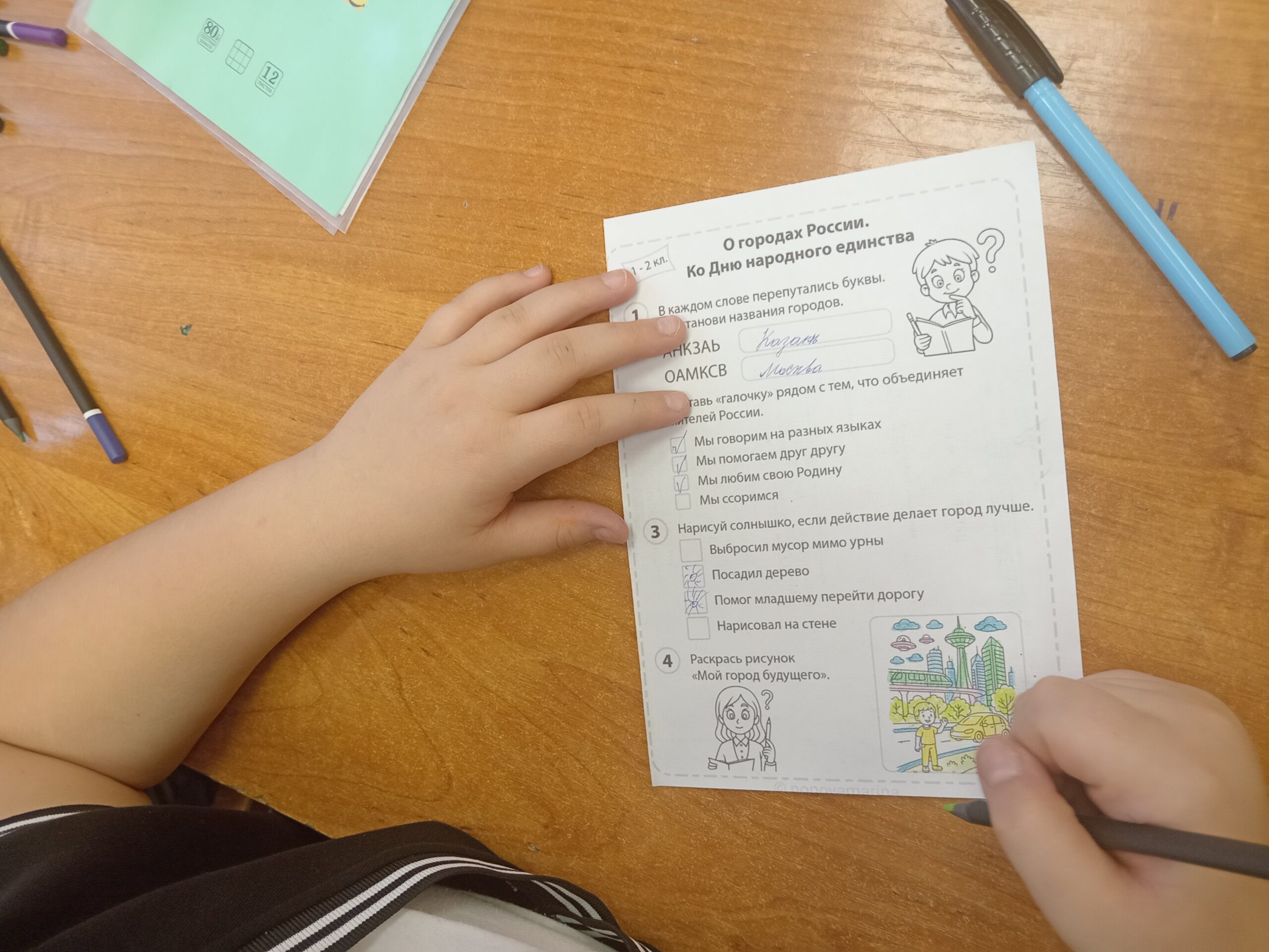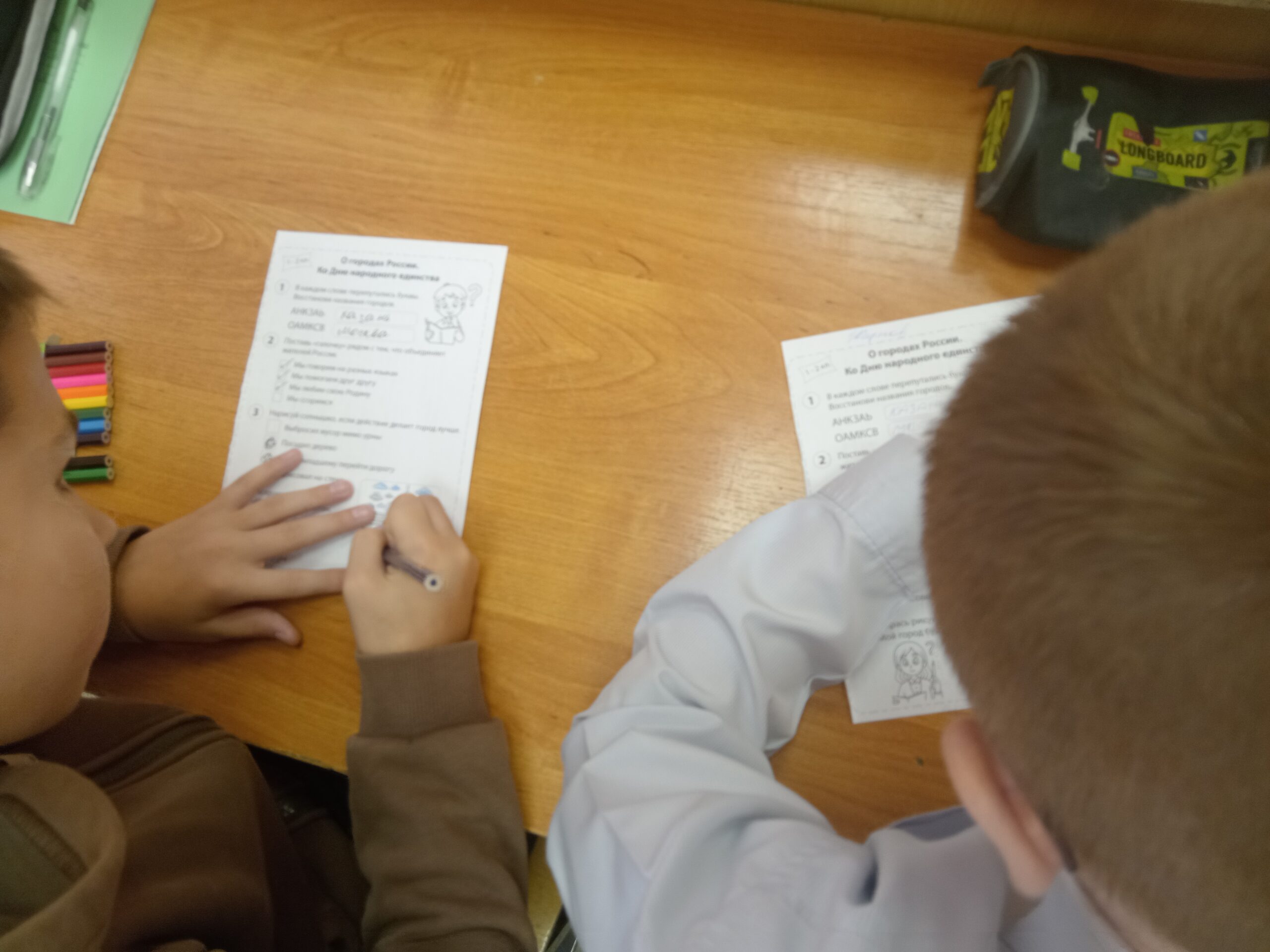 Ребята говорили о единстве народов, о важности дружбы и взаимопомощи в нашей жизни. Ребята поработали в рабочих листах «4 ноября».