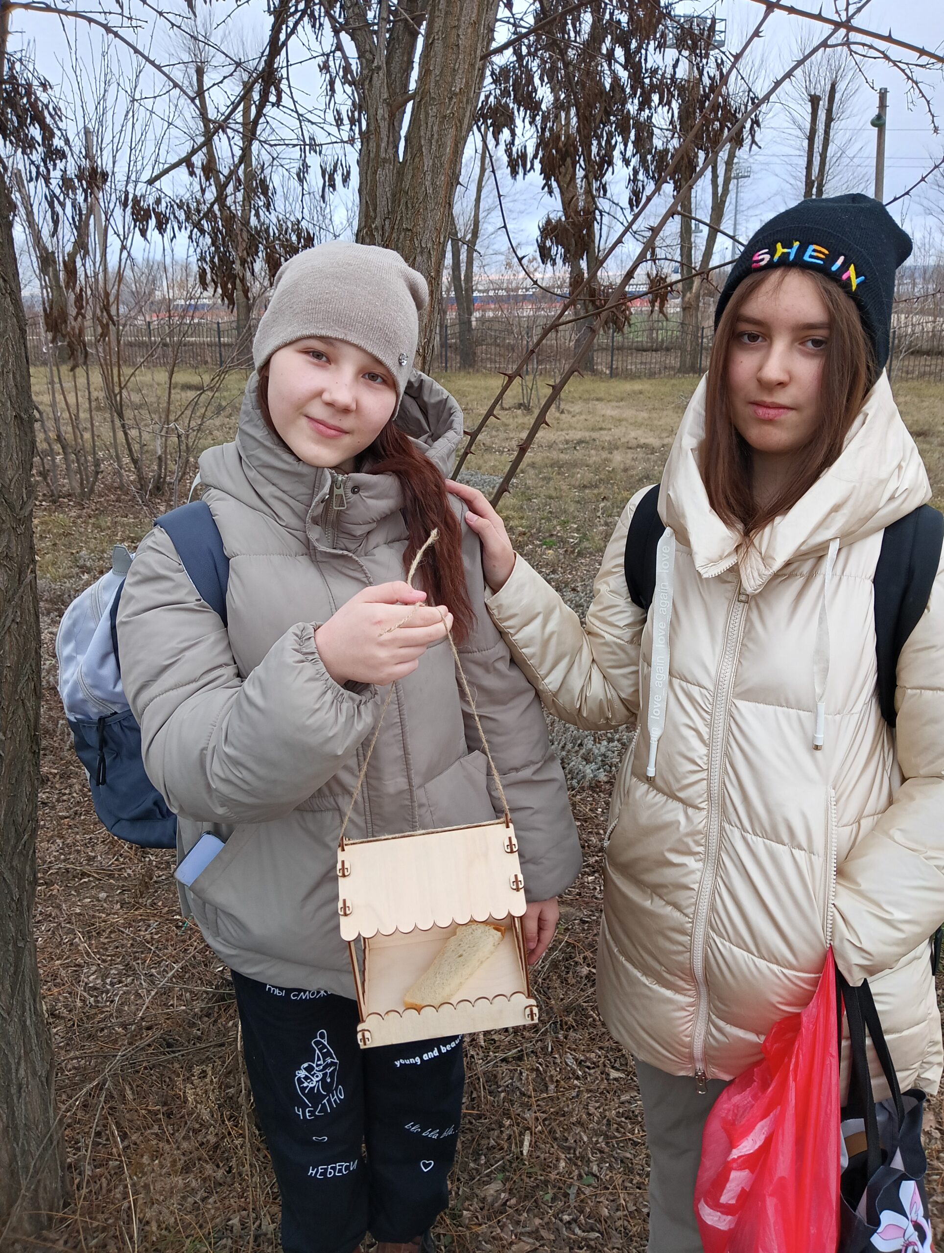 Кормушки установлены в школьном дворе. Теперь зимующие птицы — снегири, синицы, вороны и воробьи — будут знать, где найти подкормку в холодные дни.